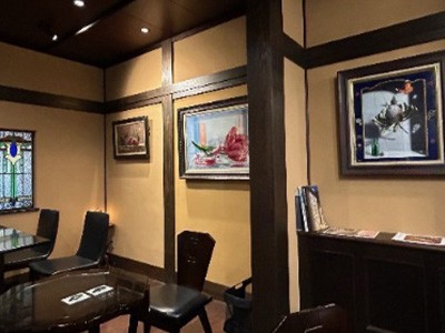 カフェのオーナーの不老さんは中原さんの絵に日動画廊で出会い、ひとめぼれしたとか。私はというと、以来、太宰府に行った時にはここで、チョコレートショップとのコラボスイーツ「紅梅」や「白梅」をいただきリラックスした時間を過ごす。 (雑誌「THE BASICS FUKUOKA ARTSCAPE#01」より)