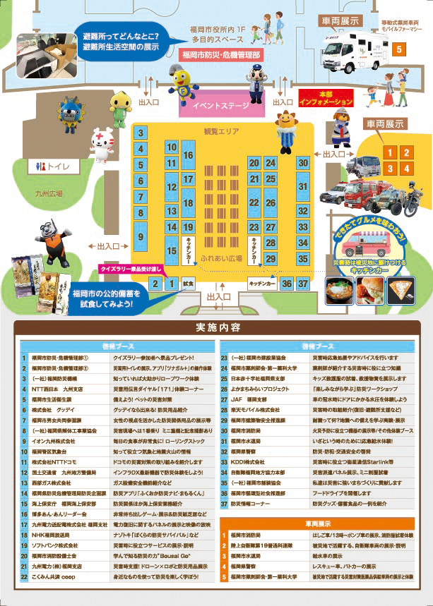 会場では、防災に関わる約40の団体・企業が啓発ブースを出展。防災に役立つ知識や技術、最新機器などを、「見て 学んで 体験」できます。